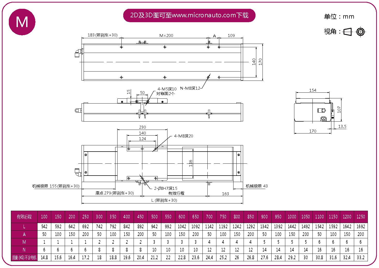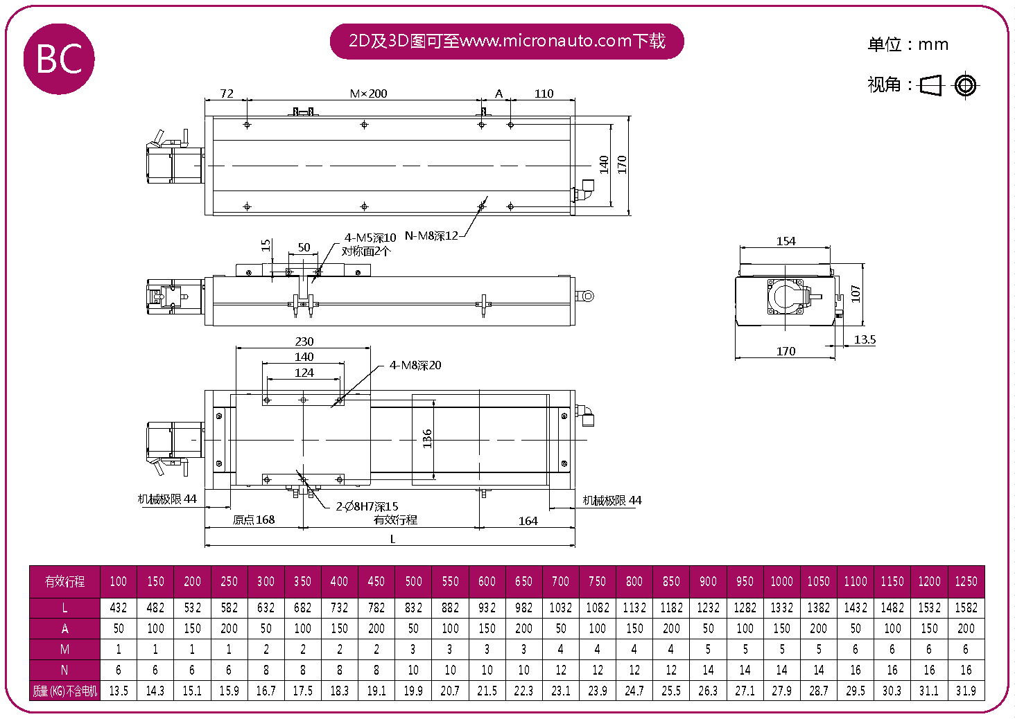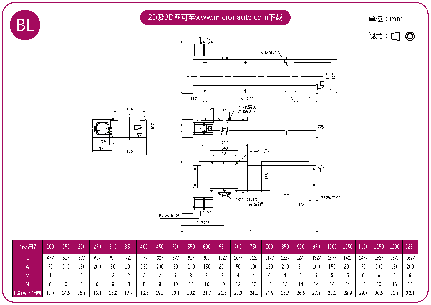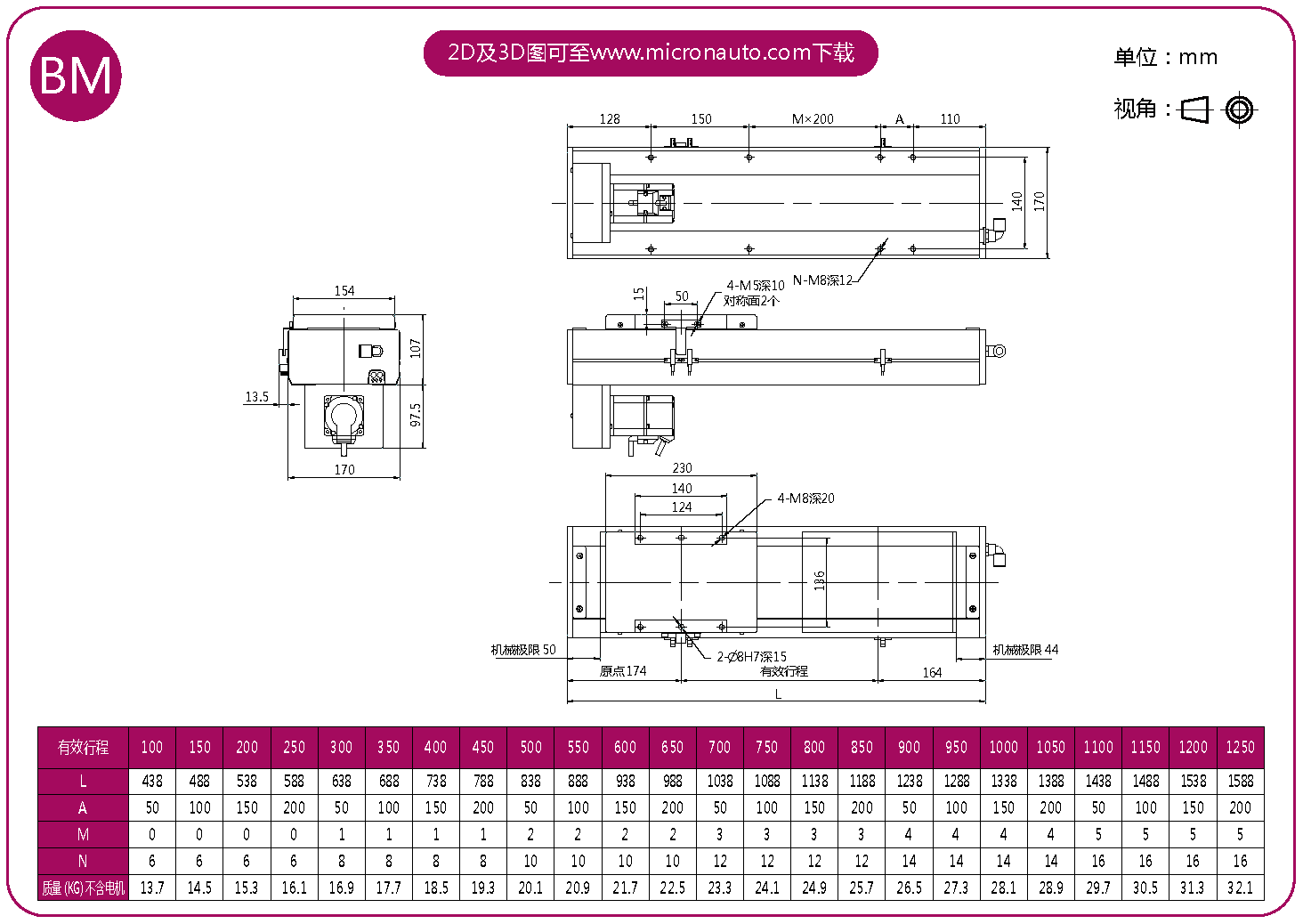 標準有效行程: 100~1250mm(間隔50mm)