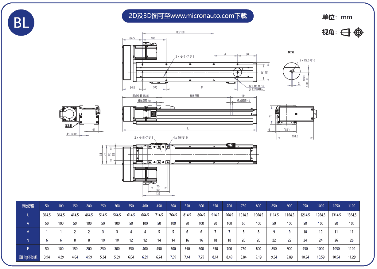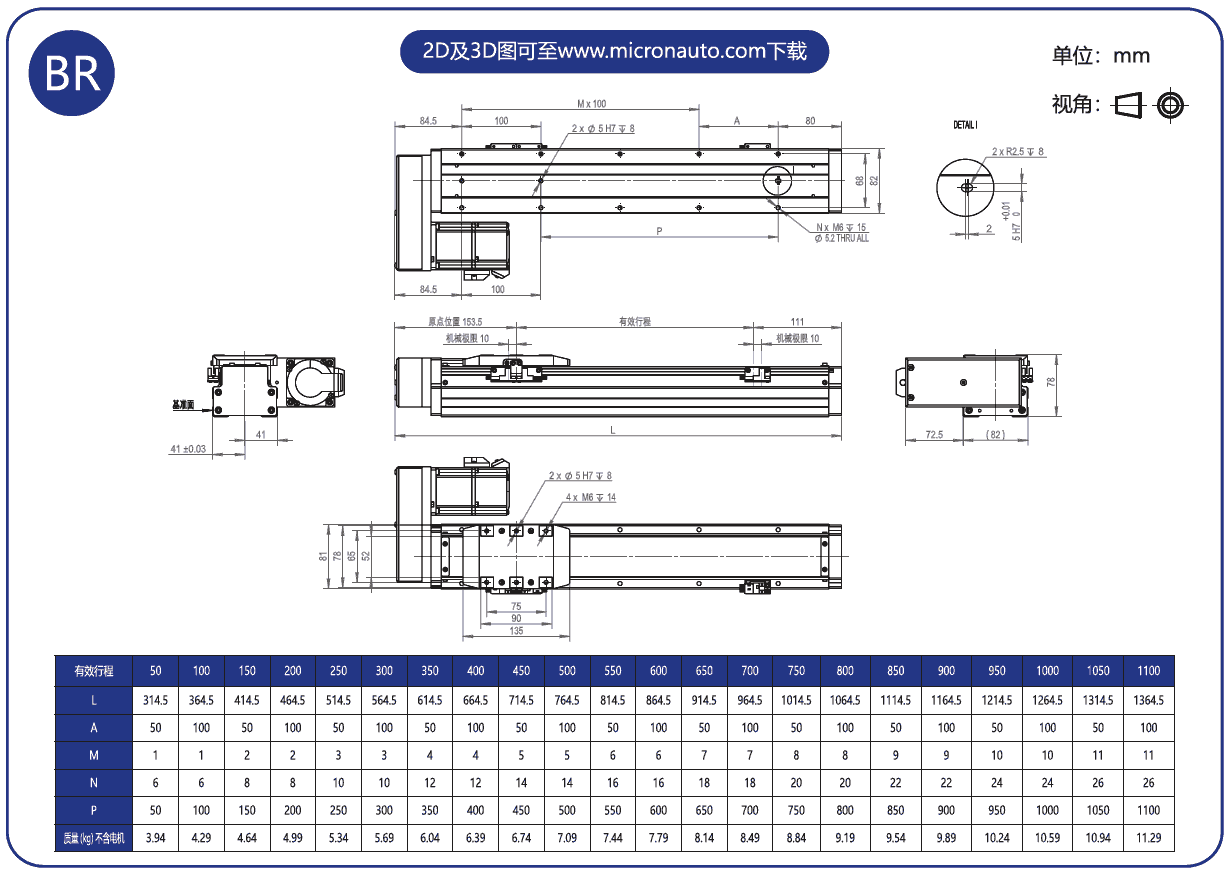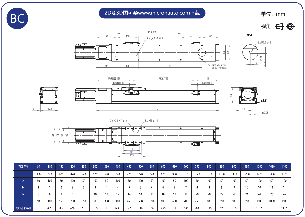 標準有效行程: 50~1100mm(間隔50mm)